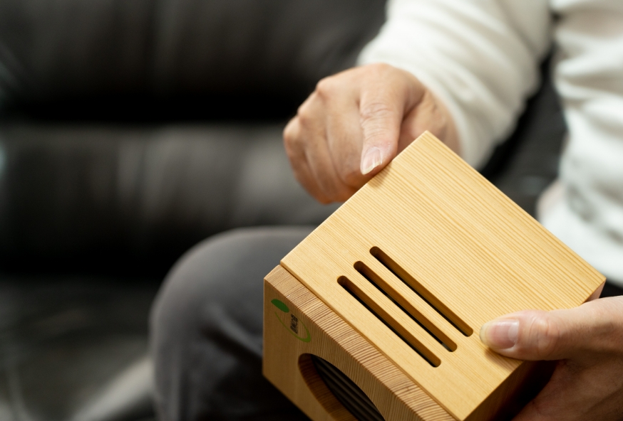 木の柔らかな温もりが感じられる風合いは、お部屋の一つのインテリアとして空間に自然と馴染みます。毎日、目に触れるものだからこそ、寛ぎの時間を快適に過ごしていただけるよう、暮らしに寄り添い、生活に溶け込むようにデザインをしました。コンパクトな見た目でお部屋をまるごと癒しの空間に清浄します。