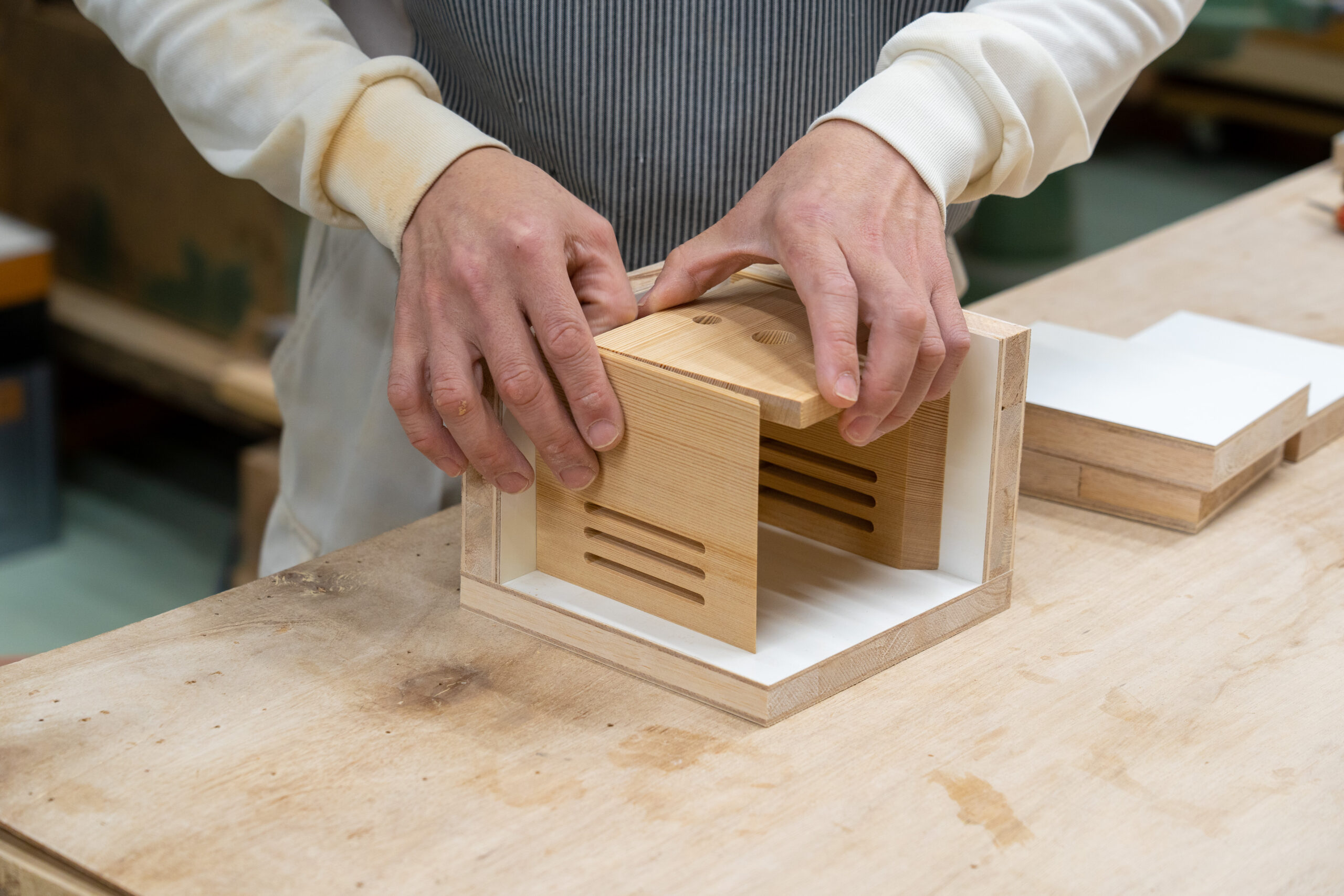 Raidenに信州産唐松を使用した「信州の森 -しんしゅうのもり- 」として仕上げました。熟練した木工職人の長年の経験を元に、完成後の木の伸び縮みを計算し、一つ一つ丁寧に手作業で接ぎ合わせています。木材の状態を見極め、職人の匠な技工を用いて組み上げられた製品は、継ぎ目が一切見えずに、信州産唐松の真っ直ぐに伸びる美しい木目がより一層際立つ仕上がりとなっております。信州の豊かな森林の循環を考え、地場産の唐松材を活用した「信州の森 -しんしゅうのもり- 」は性能もさることながら見た目にも妥協をせず、細部までこだわり作り上げています。